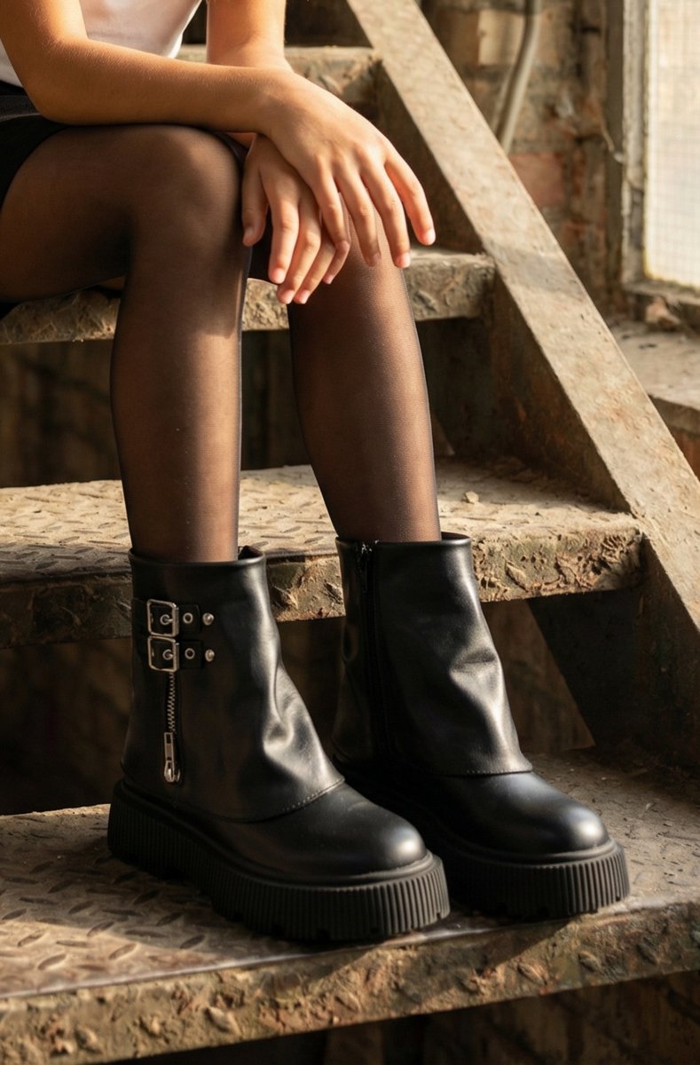 Kids' Rock Ankle Boots with Cuff and Double Buckle. Zipper Closure. Matte Finish.