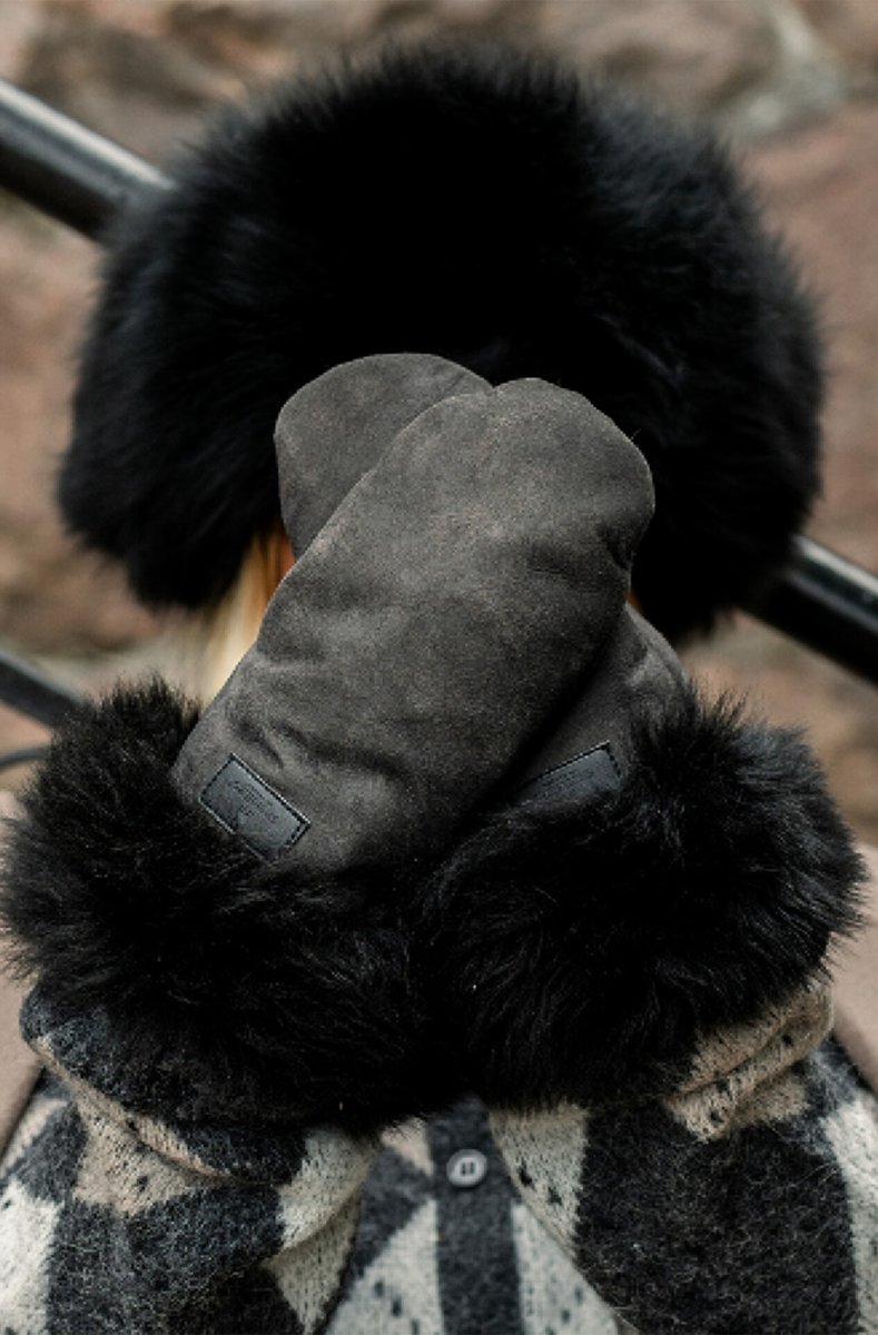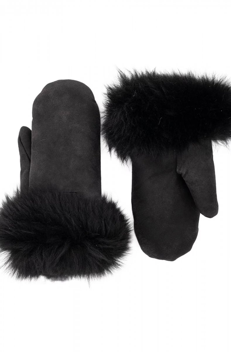 Shepherd Cortina. A pair of warm sheepskin mittens. The mittens have a wide long-hair sheepskin collar.