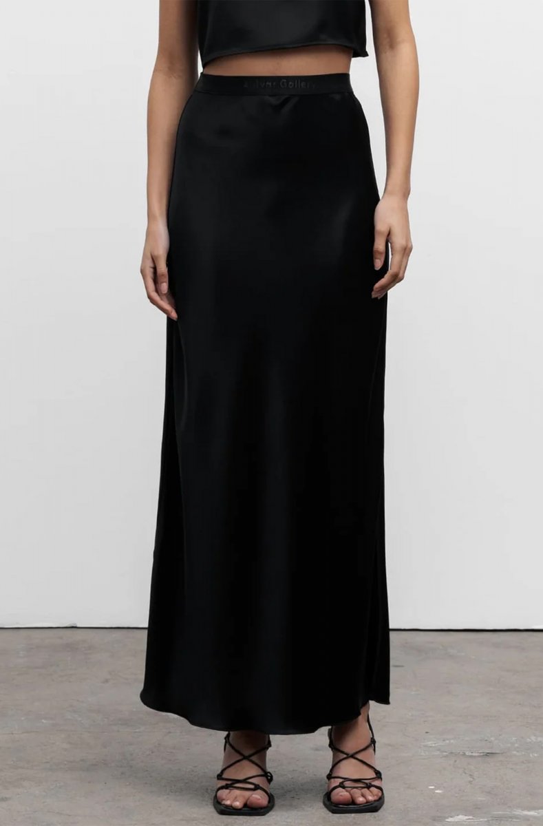 Hana long logo skirt, based on Ahlvar Gallery’s signature piece; Hana skirt, but in a full length. It’s cut from an acetate blend with a satin surface and the fabric is cut on bias for the perfect drape. The waist is decorated with our logo elastic.