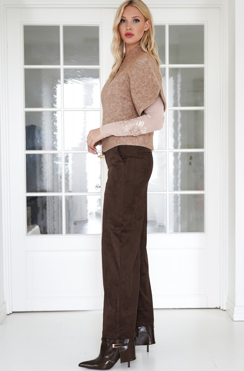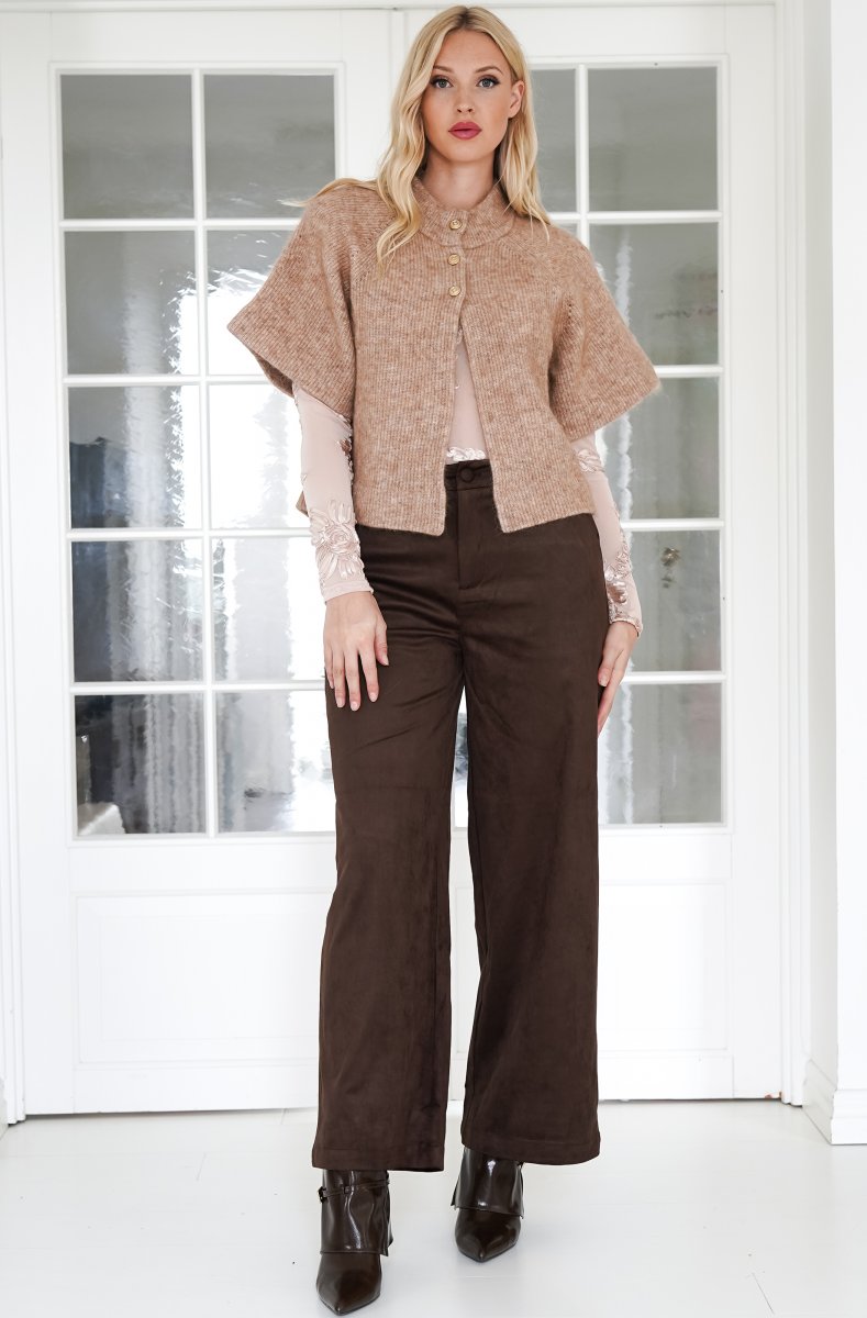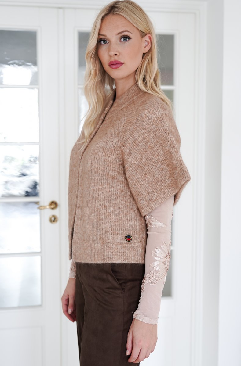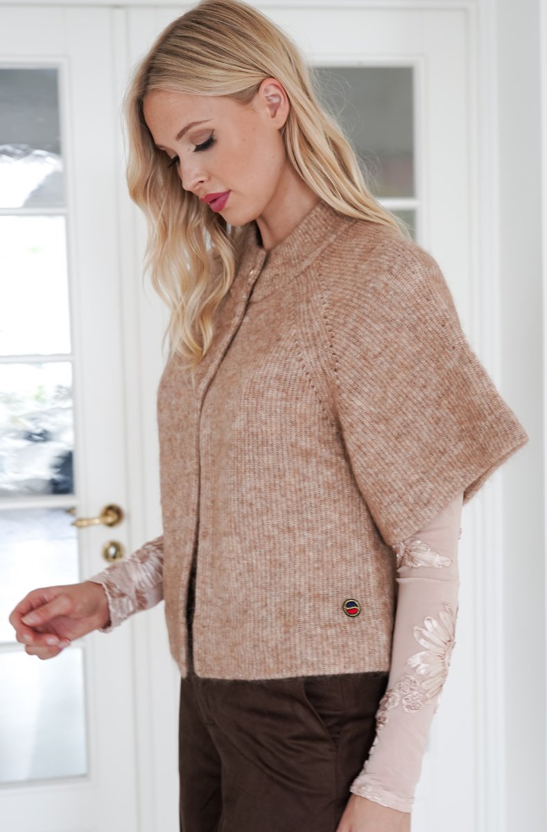Vilanie Cardigan is a cape-styled cardigan knitted from a mohair and wool blend to create a fluffy and soft structure. It has a round neck, and the shorter flutter sleeves create a beautiful silhouette and it's easy to fit even an oversized shirt underneath. It buttons at the top with three golden B-buttons.