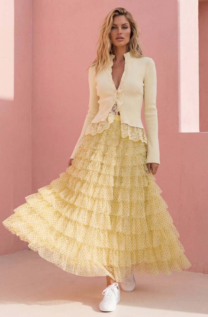En helt ljuvlig volangkjol i tyll - perfekt till fest i vår eller bara dressa ner med en t-shirt till kjolen. Onesize och denna har resår i midjan och passar upp till XL.
