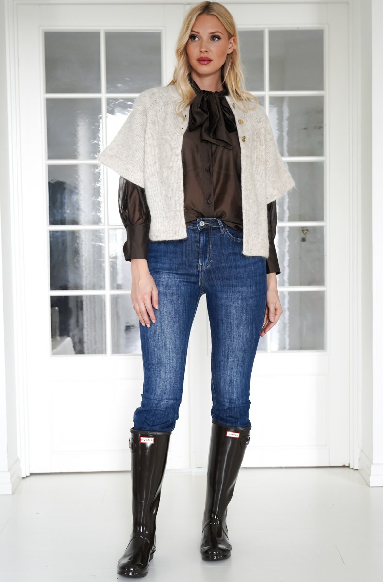 Vilanie Cardigan is a cape-styled cardigan knitted from a mohair and wool blend to create a fluffy and soft structure. It has a round neck, and the shorter flutter sleeves create a beautiful silhouette and it's easy to fit even an oversized shirt underneath. It buttons at the top with three golden B-buttons.