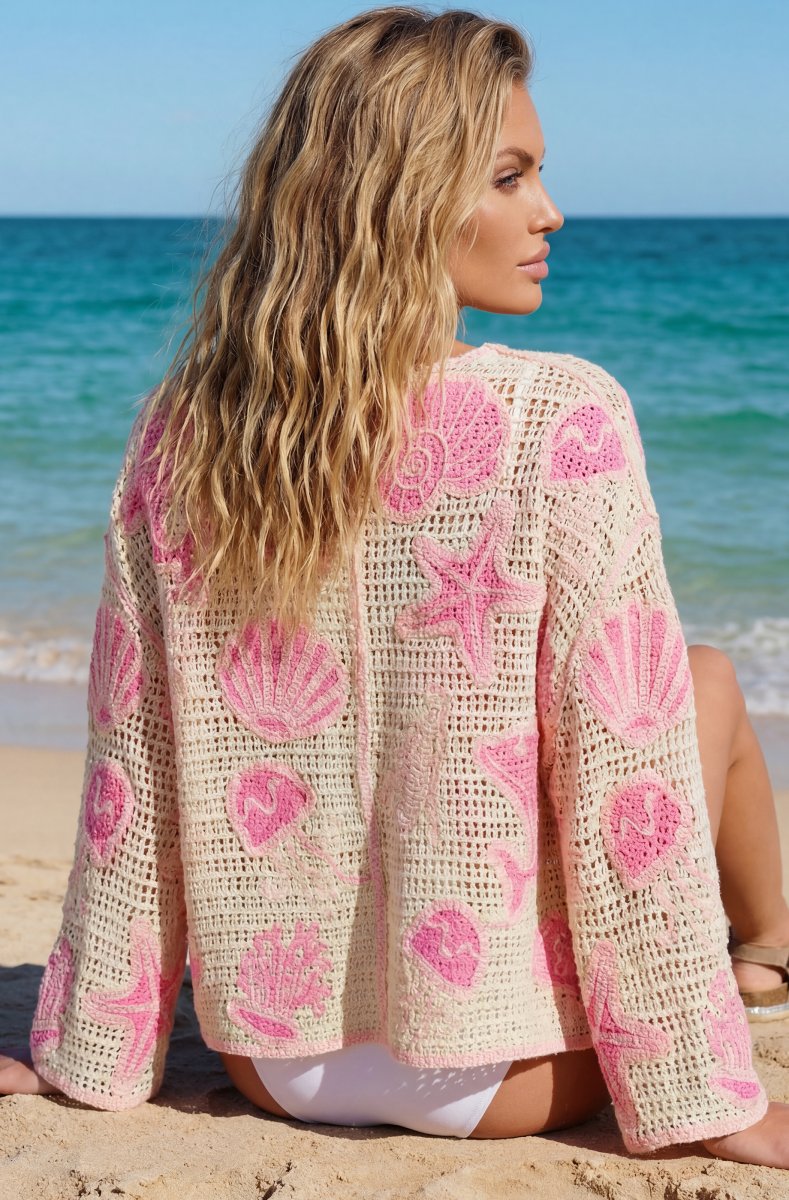 Så otroligt söt virkad kofta med snäckor och sjöstjärnor. Denna är onesize och passar XS-XL