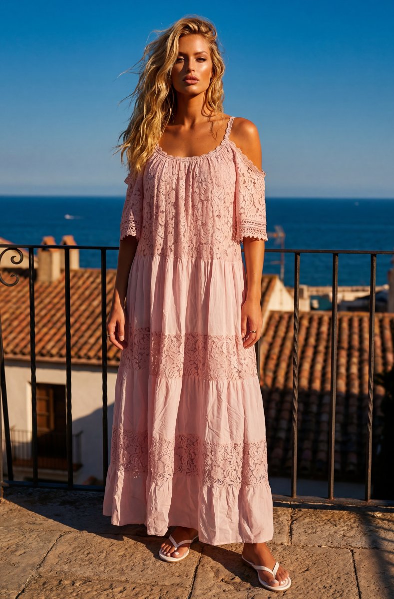 Lång klänning med en mjuk och feminin silhuett, med tunna axelband, ett brett halsband och en spetsöverdel som skapar en elegant lager-på-lager-effekt. Kjolen faller mjukt med lätta volanger och ton-i-ton spetsinslag som ger rörelse och en romantisk touch. Perfekt för boho-chica sommarlooker, semestrar, resorter och avslappnade men ändå polerade tillfällen. Bär den med platta sandaler, kilklackar eller naturliga accessoarer för en fräsch och raffinerad outfit. One size passar upp till XL.