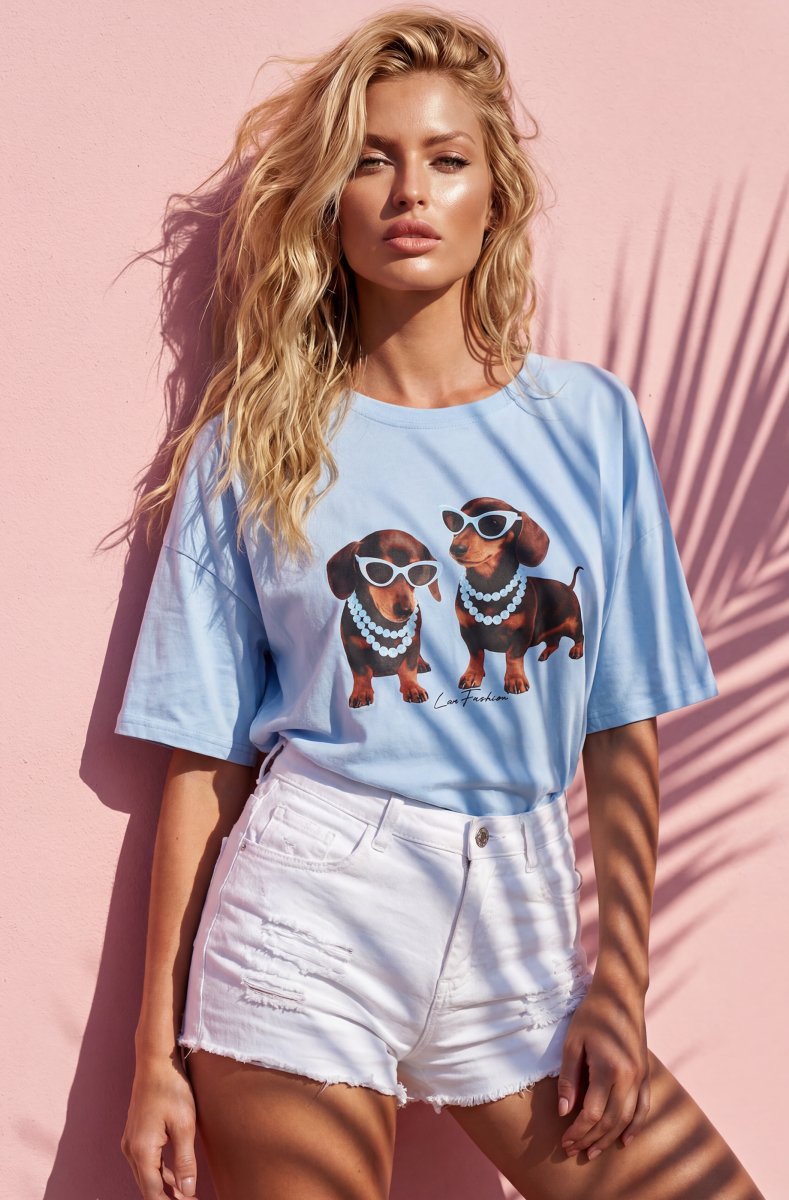 Så fin och trendig t-shirt med taxar på - som har choca halsband med pärlor! Älskar! Onesize som passar upp till L/XL.