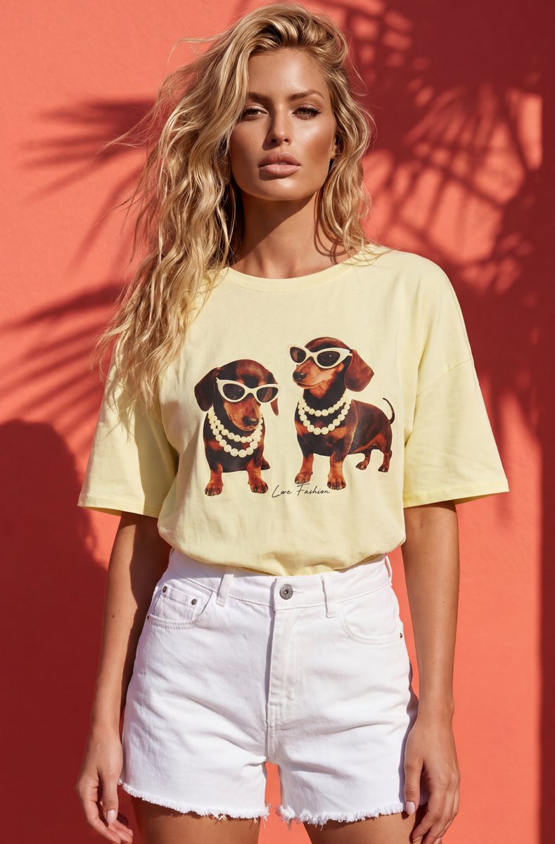 Så fin och trendig t-shirt med taxar på - som har choca halsband med pärlor! Älskar! Onesize som passar upp till L/XL.