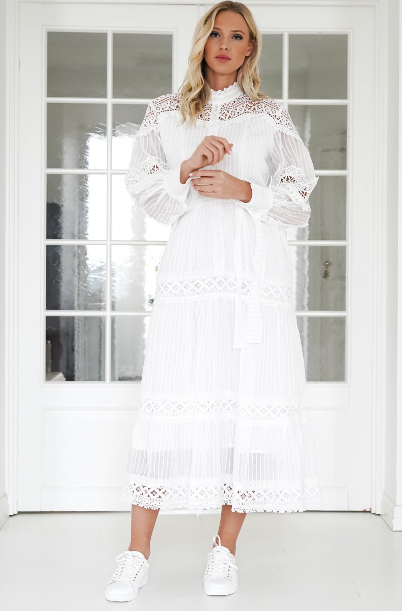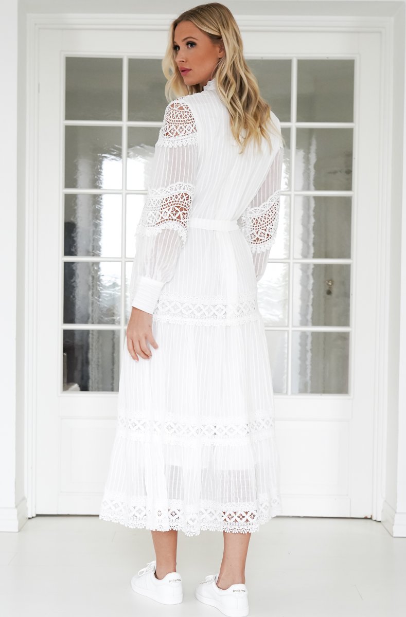En otroligt vacker maxiklänning i vitt med fina spetsdetaljer. Vacker krage och fin ärm Den här är som gjord för en sommarfest! Ljuvlig på och så fint med bältet!