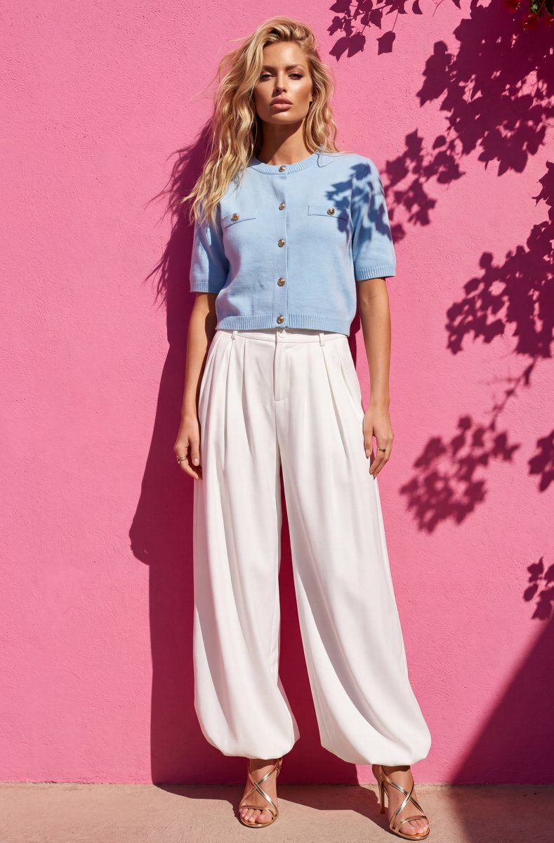 Otroligt chic kortärmad kofta med fina knappar och detaljer - lite Chanel-känsla. Finns i flera vackra färger och denna är onesize och passar upp till L.