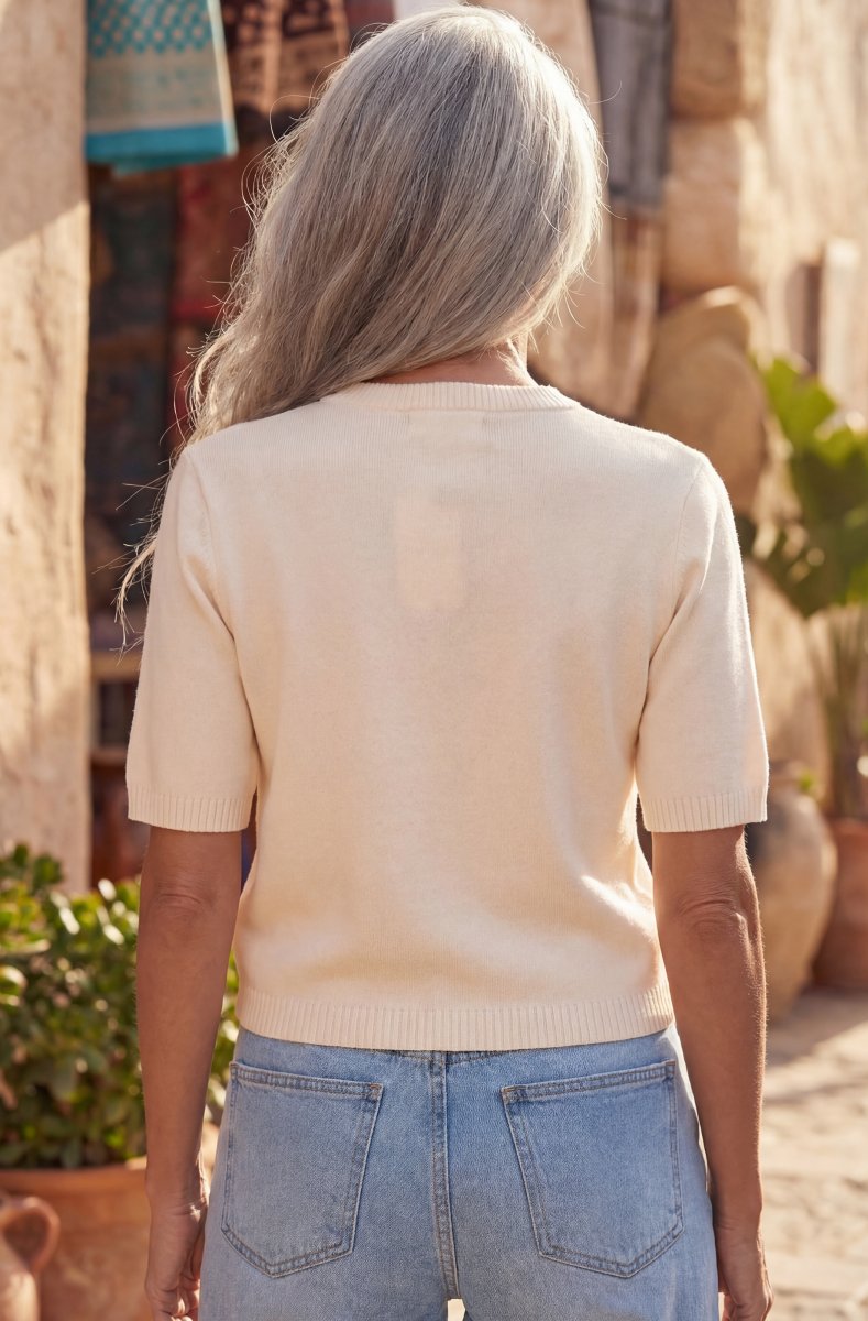Otroligt chic kortärmad kofta med fina knappar och detaljer - lite Chanel-känsla. Finns i flera vackra färger och denna är onesize och passar upp till L.