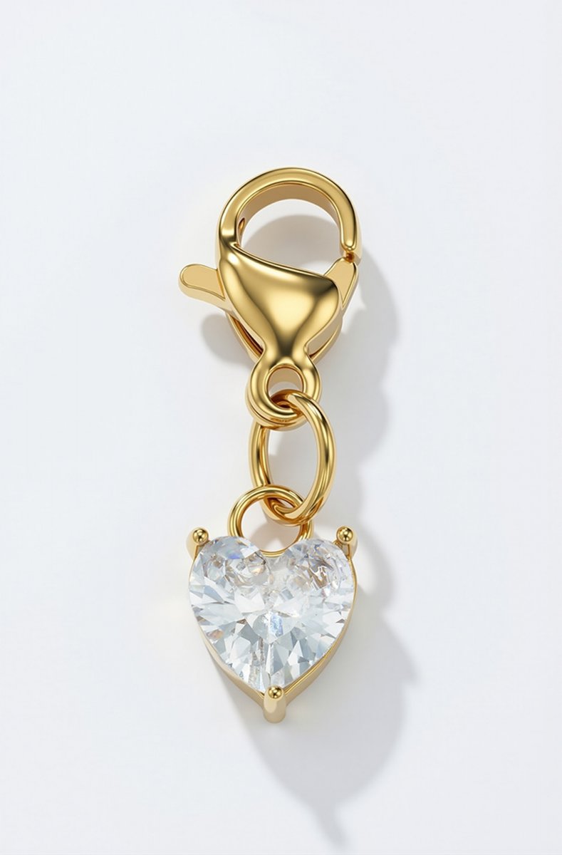 Vacker berlock i gold med en vit sten i form av ett hjärta.