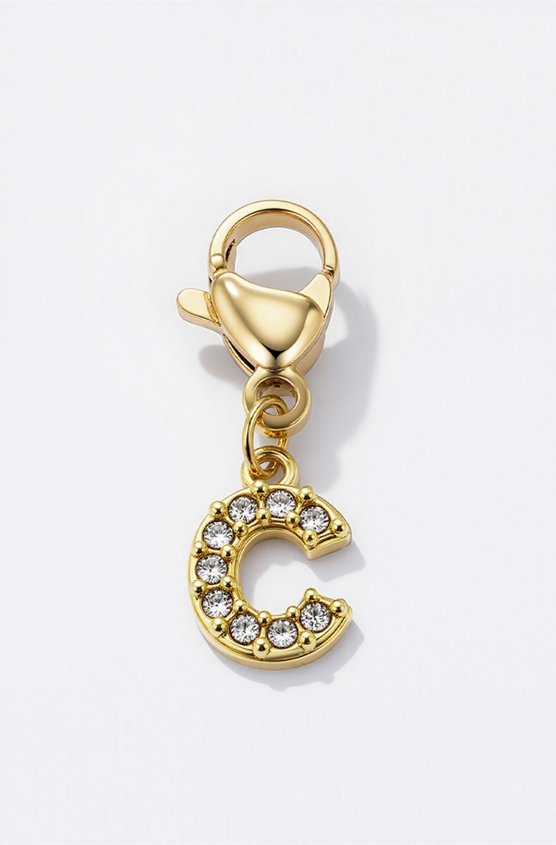 Gold letter charm with rhinestone details.