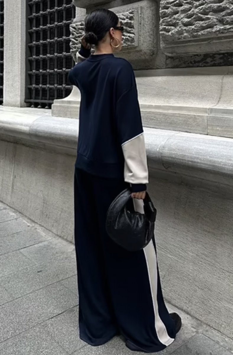 ursnyggt set med tröja och sweatpant. Byxorna har snygga revärer och tröjan så snygg ringning, .Säljs som set och detta vill man bara inte missa
