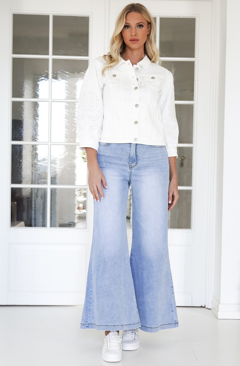 Snygg jeans jacka med vackert arbetade ärmar. Ursnygg i vår och sommar - till allt. Så snyggt med vitt