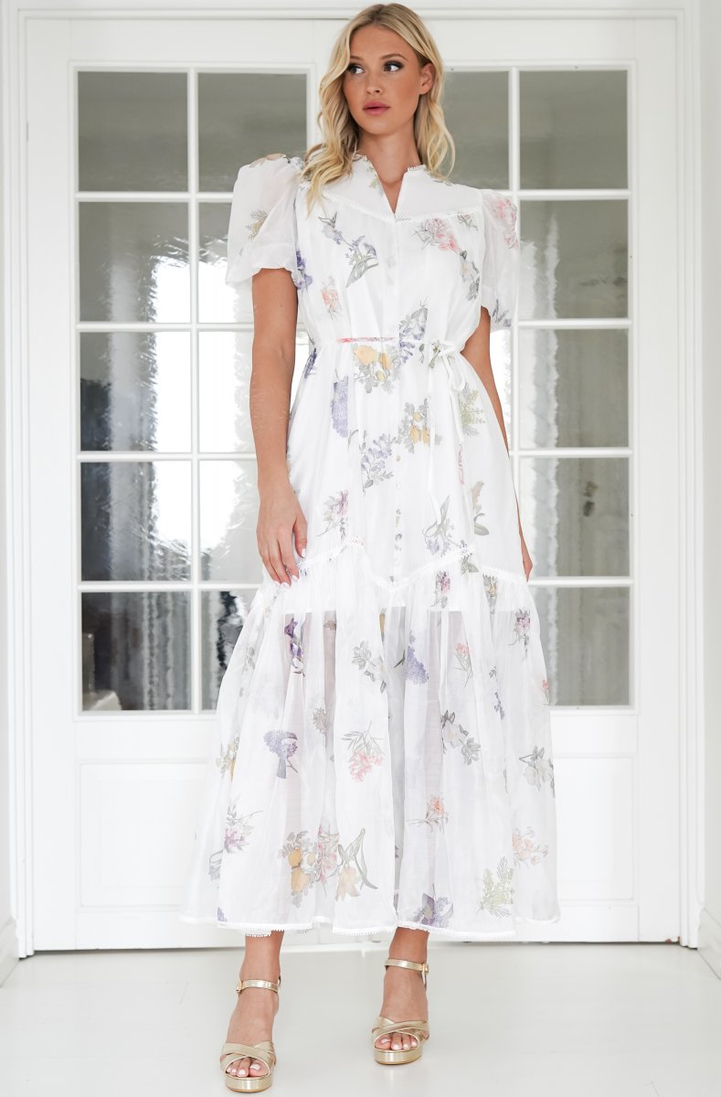 En helt fantastisk maxiklänning i vitt med blommor på. Fantastiskt fall och så skön kvalite - bomull/lin. Den här är som gjord för en sommarfest