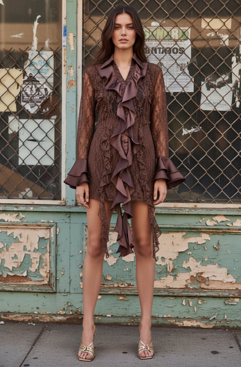 Fantastisk klänning med så fina detaljer. Volanger vid ärmslut och fram vid ringningen och fantastisk spets med glitterdetaljer över hela spetsen som inte syns på bilderna.