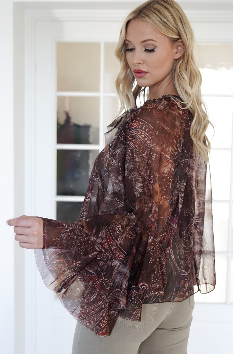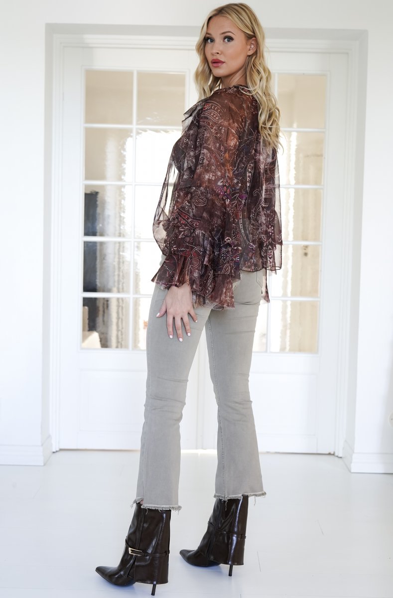 Magisk blus i brunt mönster och fantastiaska volanger