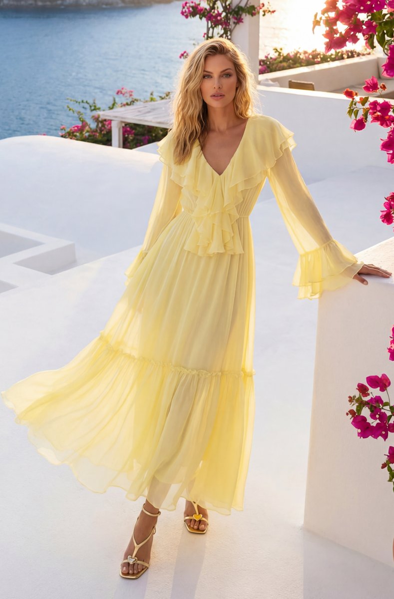 Den perfekta festklänningen med så vackra volanger - snyggt ringad och med lång ärm. Som gjord för en sommarfest