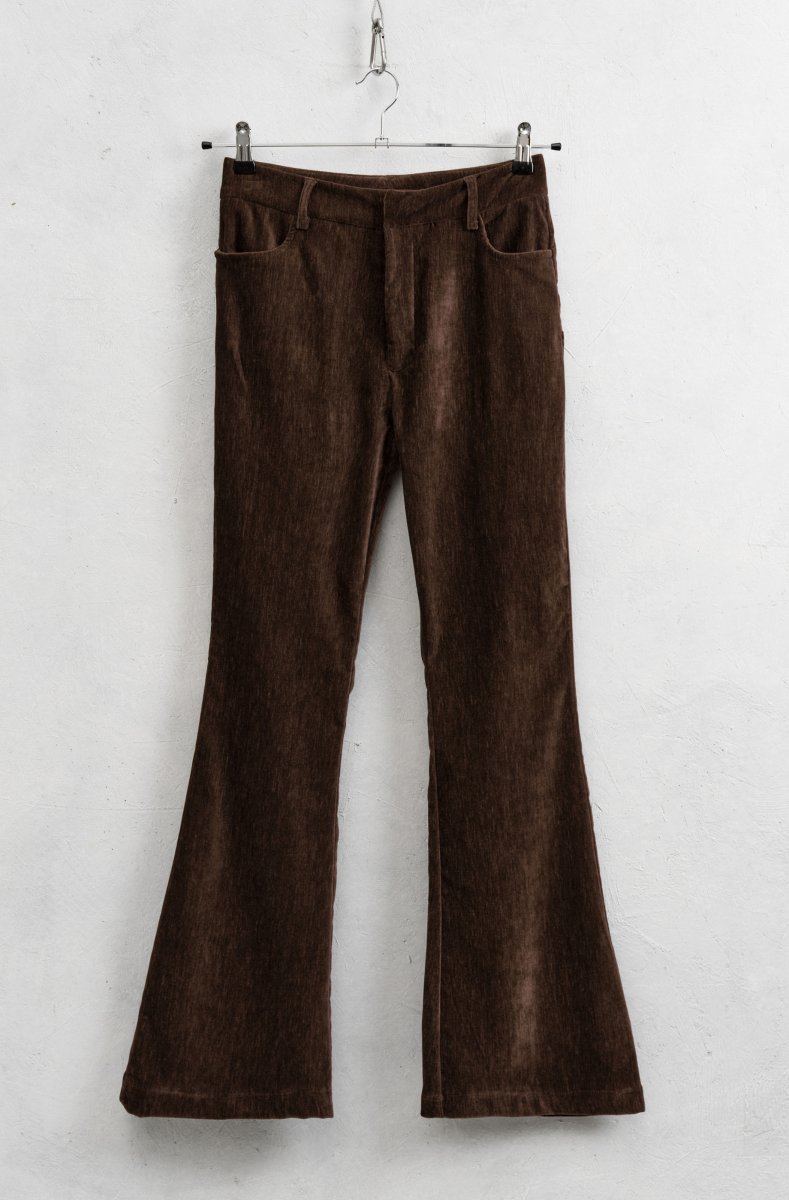Velvet flared trousers. Front pockets and belt loops at the waist. Front zip and hook closure. Regular fit, available in size S/M/L.