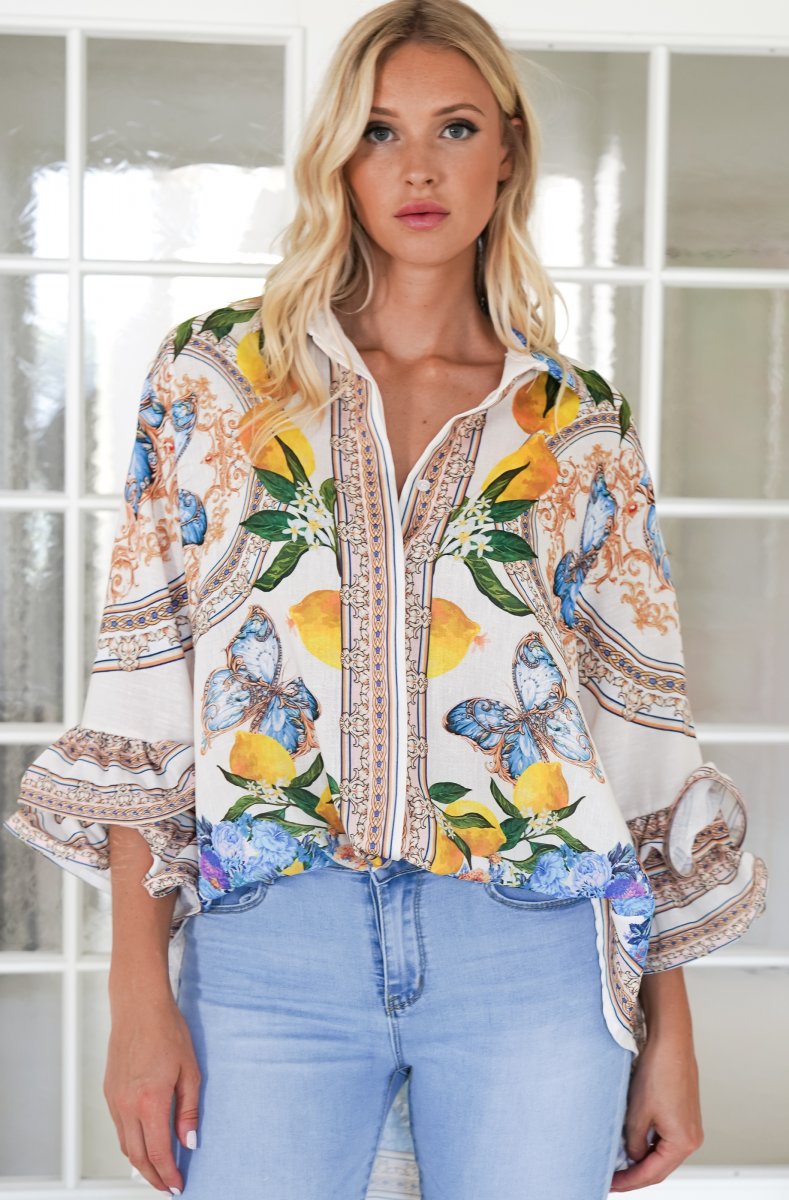 Fantastisk mönster med citroner och fjärilar och en superfin modell på skjorta!