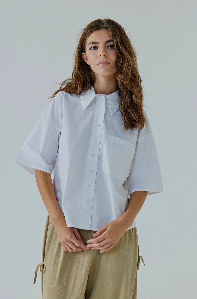 Boxig blus i krispig bomull med klassisk krage, knappstängning framtill och vida korta ärmar. Designad med ett öppet bakre sprund och slipsdetalj, vilket ger en modern twist till en tidlös pjäs.