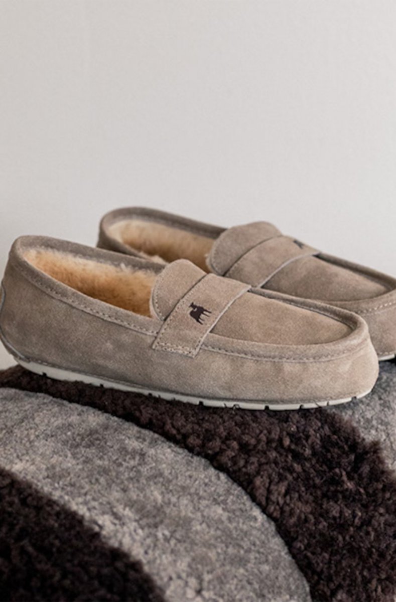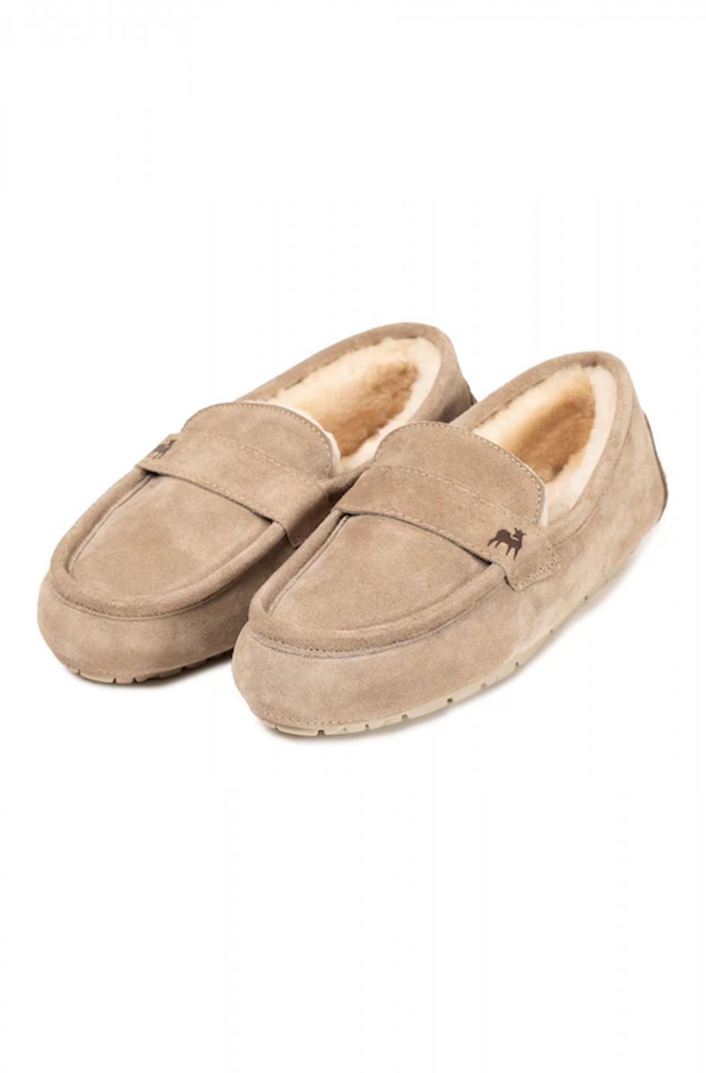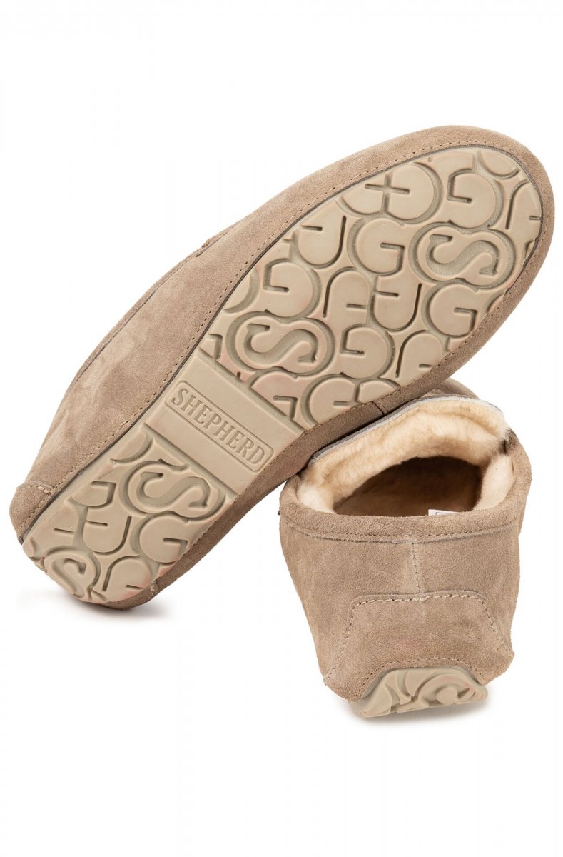 Shepherd Denver. Ett par tofflor i klassisk mockasinmodell med insida i fårskinn. Tofflorna har en dekorativ söm fram. Yttersula i gummi med mönster.