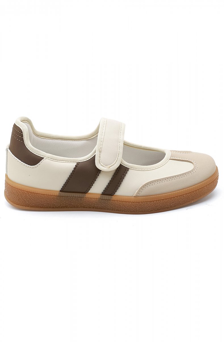 Coola sneakerinas i beiget med bruna detaljer och ett kardborrband.