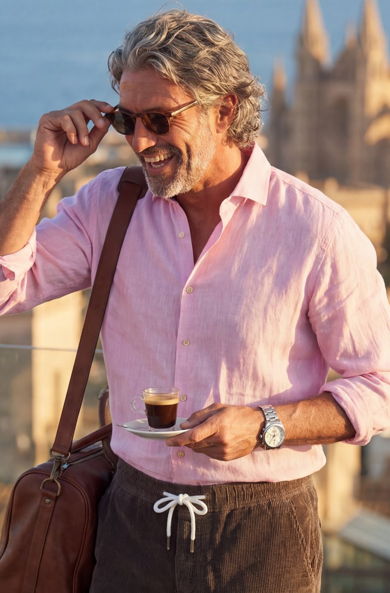 A must-have for the style-conscious man, this pink linen shirt combines classic sophistication with the cooling comfort of linen.