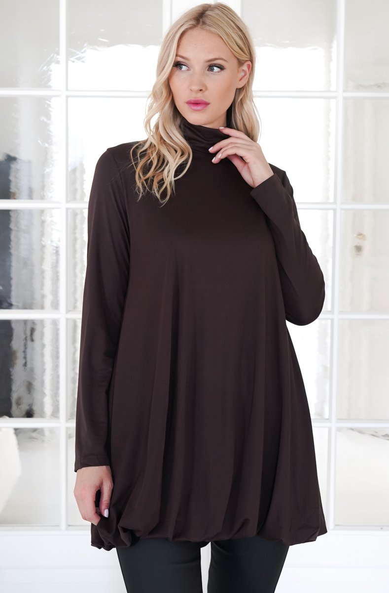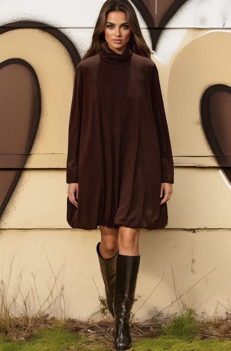 En riktigt måste-ha-klänning! Dröm i choco och så fin ballongkjol och högre hals. Snygg både till vardags och fest och en superskön viskosmix med lite stretch i!