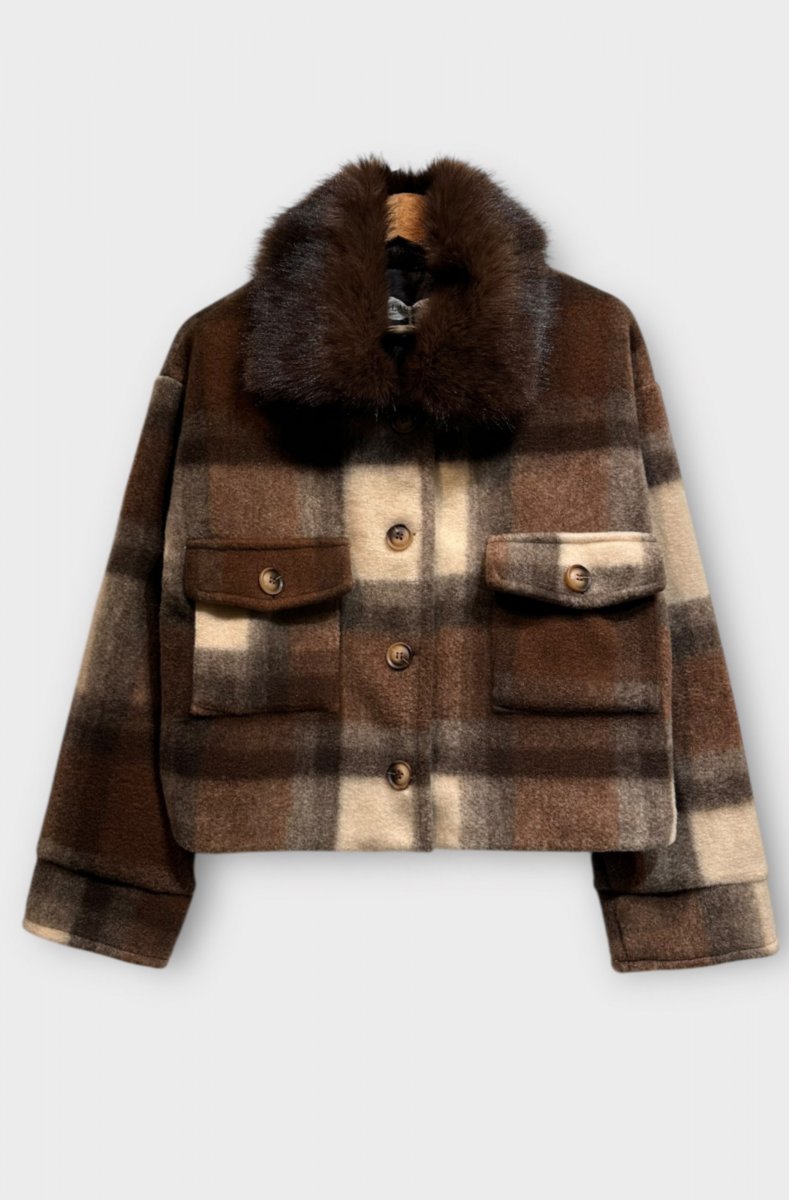 Avslappnad cool rutig jacka i brunt med skön fuskpäls vid krage och fickor