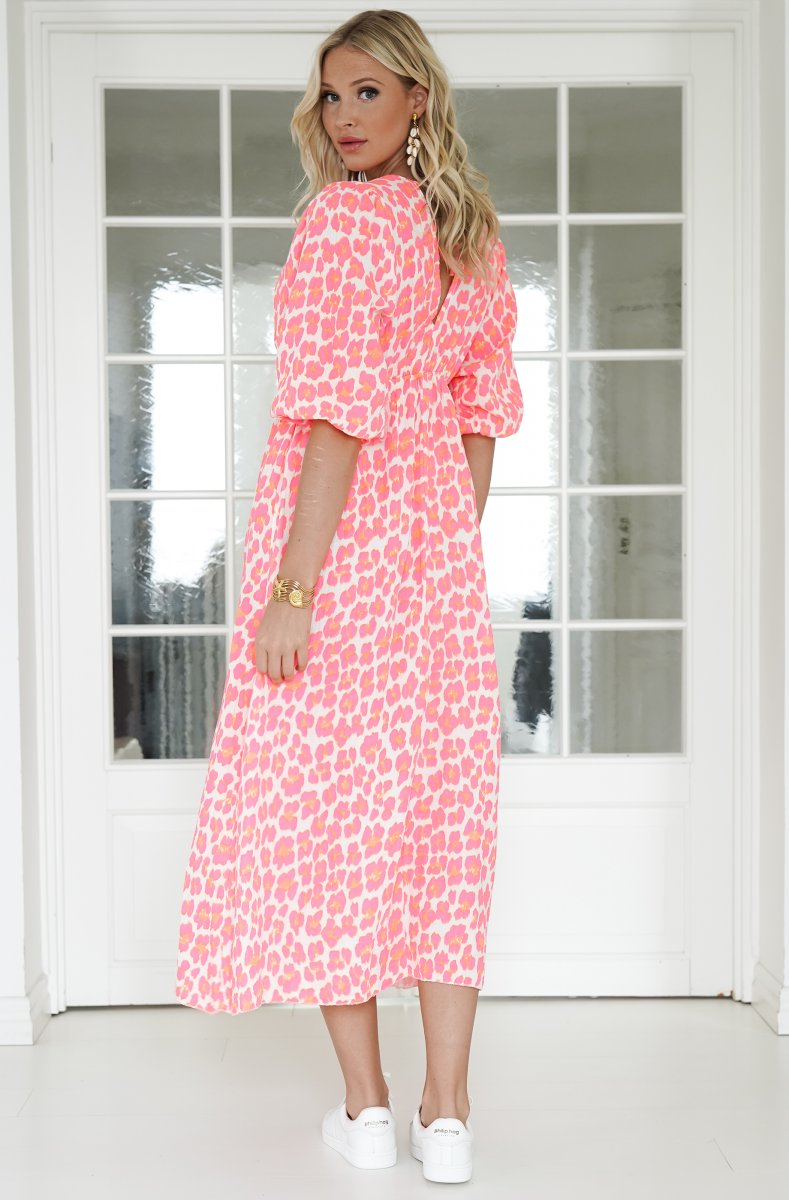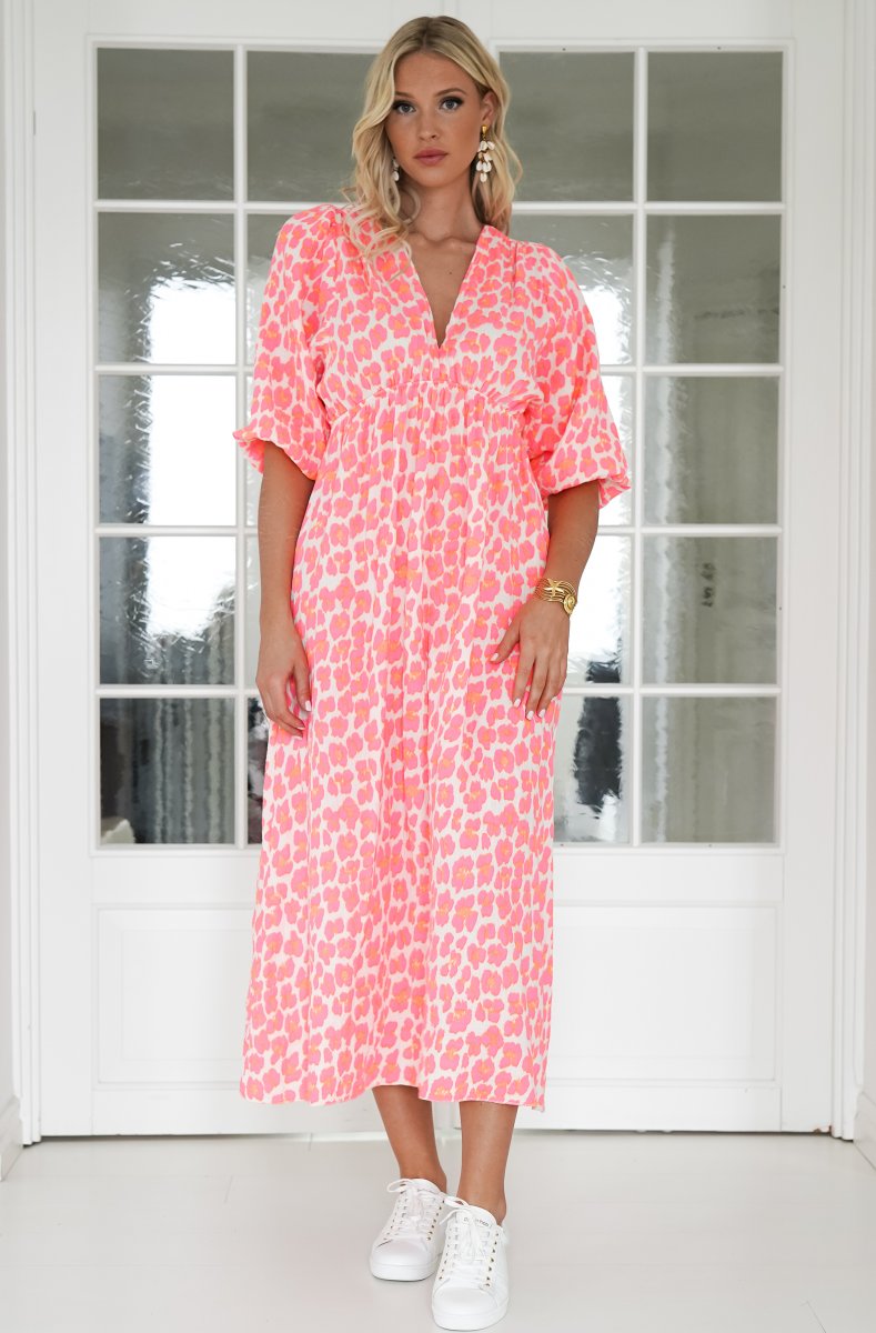 Superhärlig v-ringad klänning i snyggt rosa leomönster. Fantastiskt skön på - helt i bomull. Faller så fint och denna modell är onesize och passar upp till L