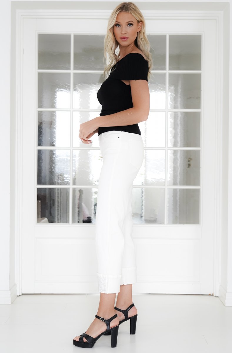 Älskar dessa vita jeans/byxor med uppvik nertill med strass-stenar. Glammiga och så snygga i vår och sommar!