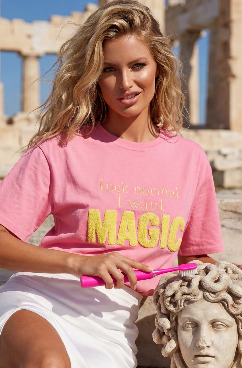 Med budskapet “Fuck normal – I want MAGIC” broderat på bröstet sätter den här t-shirten tonen direkt – lekfull, självsäker och helt omöjlig att ignorera. En perfekt statement-piece för dig som vill uttrycka din personlighet med stil.